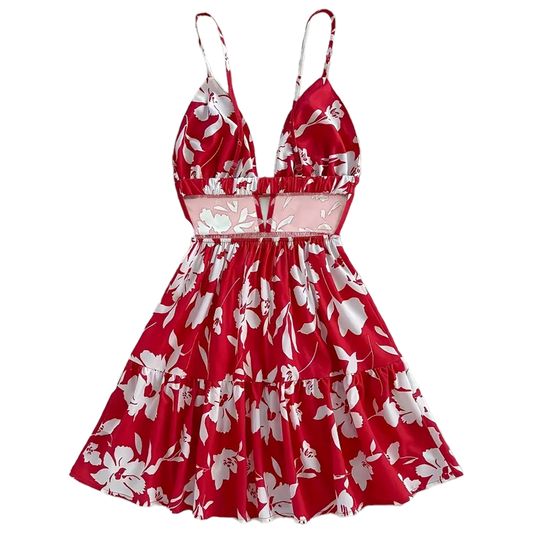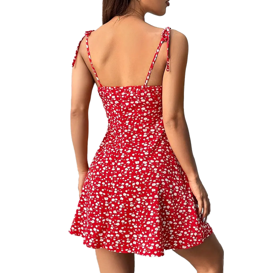 Červené mini šaty s viazanými ramienkami a kvetinovým vzorom