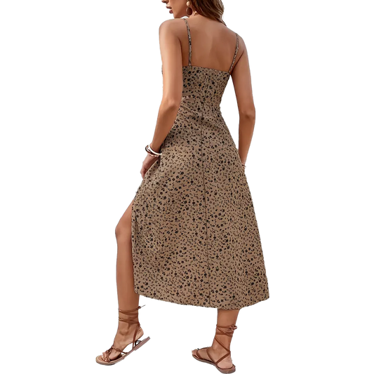 Béžové midi šaty s tenkými ramienkami a rozparkom