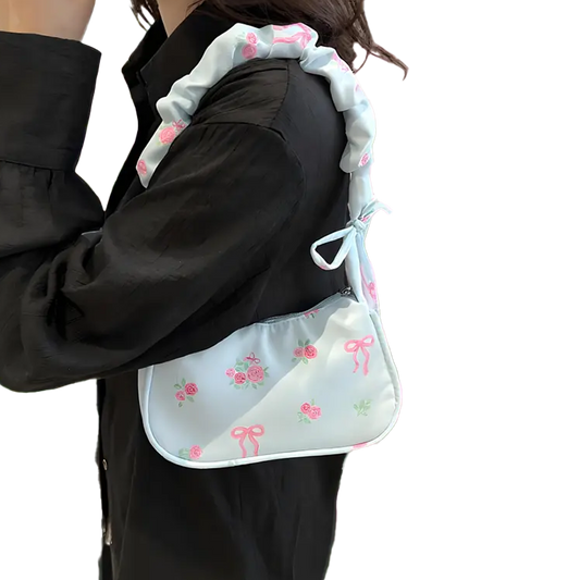 Biela kabelka s ružovým kvetinovým vzorom a volánovou rúčkou