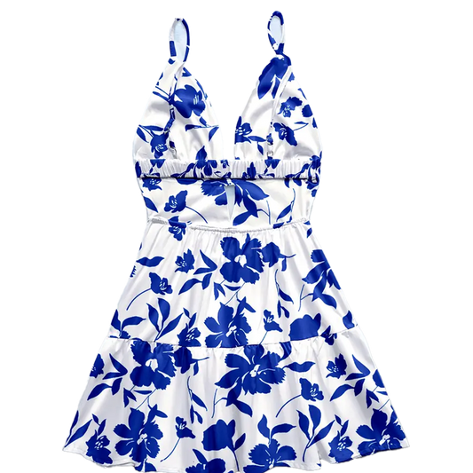 Biele letné šaty s modrým kvetinovým vzorom a tenkými ramienkami