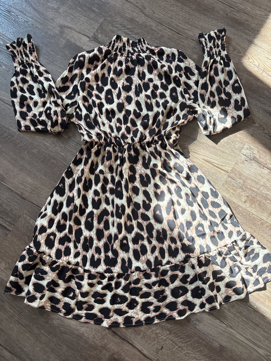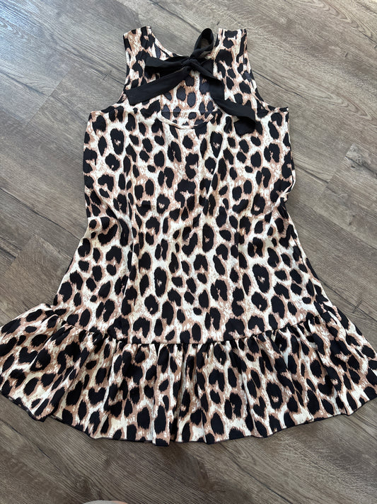 Leopardie voľné šaty s volánovým lemom a mašľou na chrbte