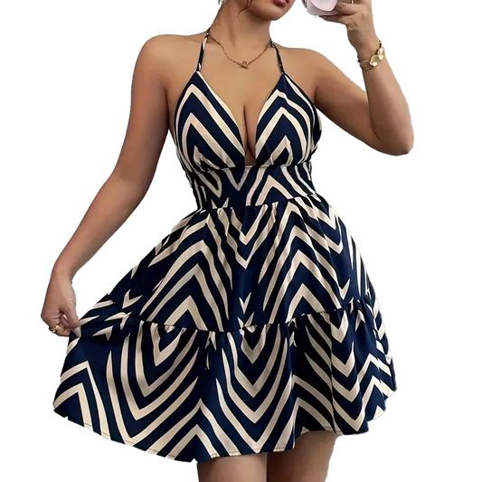 Letné mini šaty s hlbokým výstrihom a geometrickým vzorom