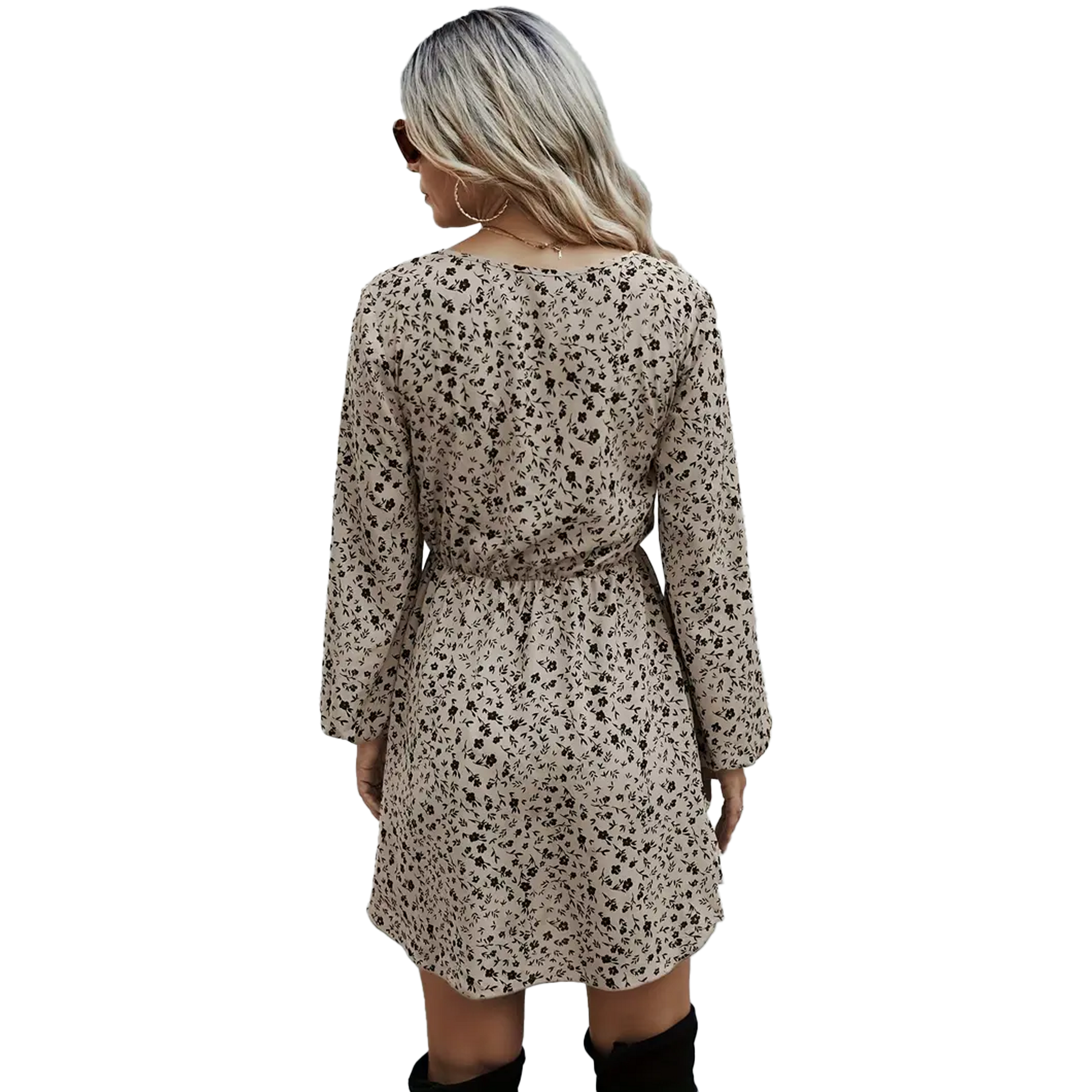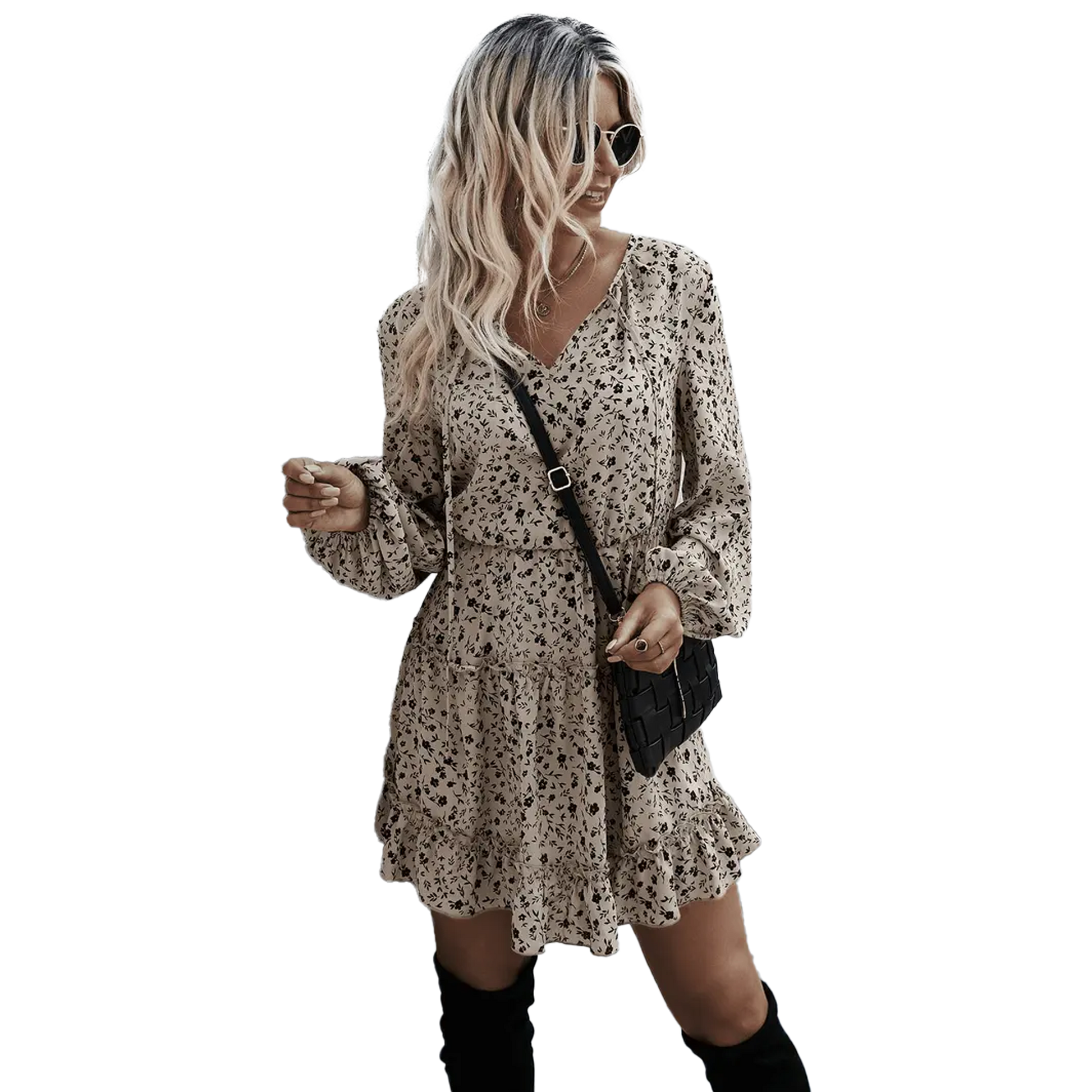 Tieto béžové kvetinové šaty s volánovým lemom sú dokonalou voľbou pre každodenné nosenie aj špeciálne príležitosti. Ľahký a vzdušný materiál poskytuje pohodlie počas celého dňa, zatiaľ čo jemný kvetinový vzor dodáva romantický a ženský vzhľad. Volánový lem a dlhé rukávy zvýrazňujú elegantný štýl, v ktorom sa budeš cítiť vždy sebaisto a štýlovo.