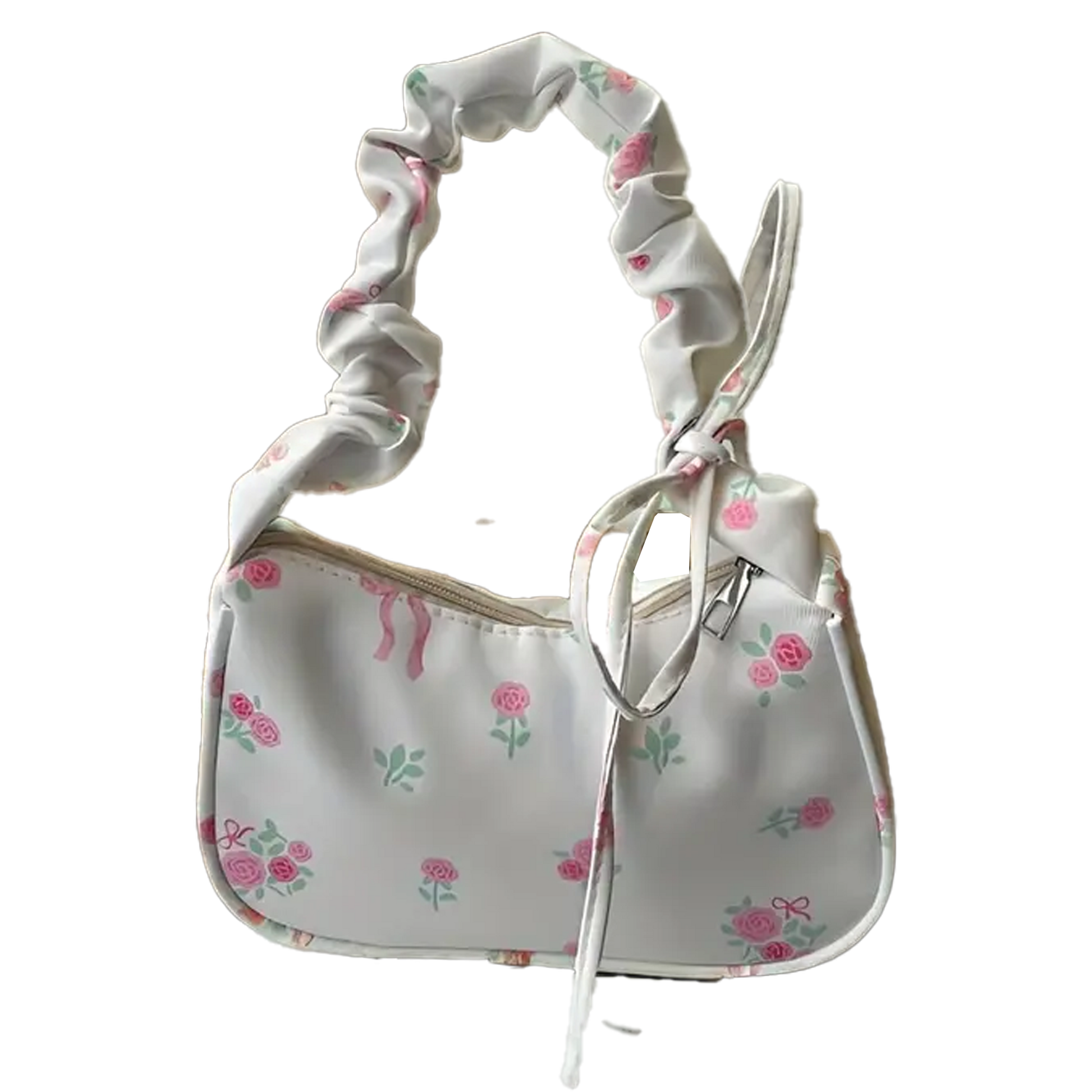 Biela kabelka s ružovým kvetinovým vzorom a volánovou rúčkou