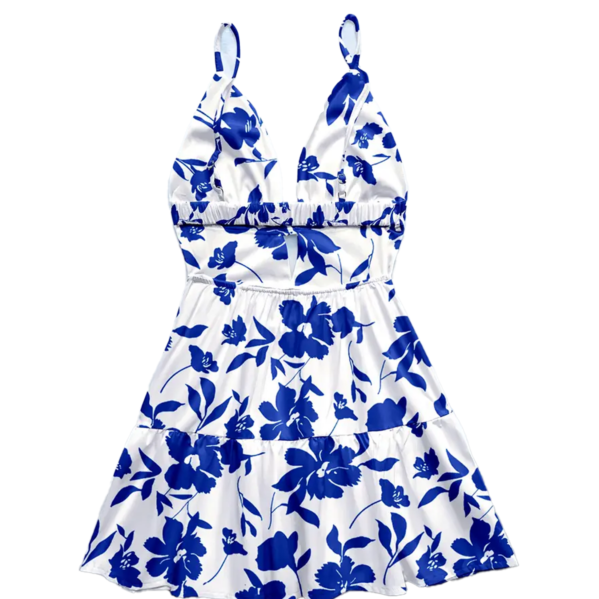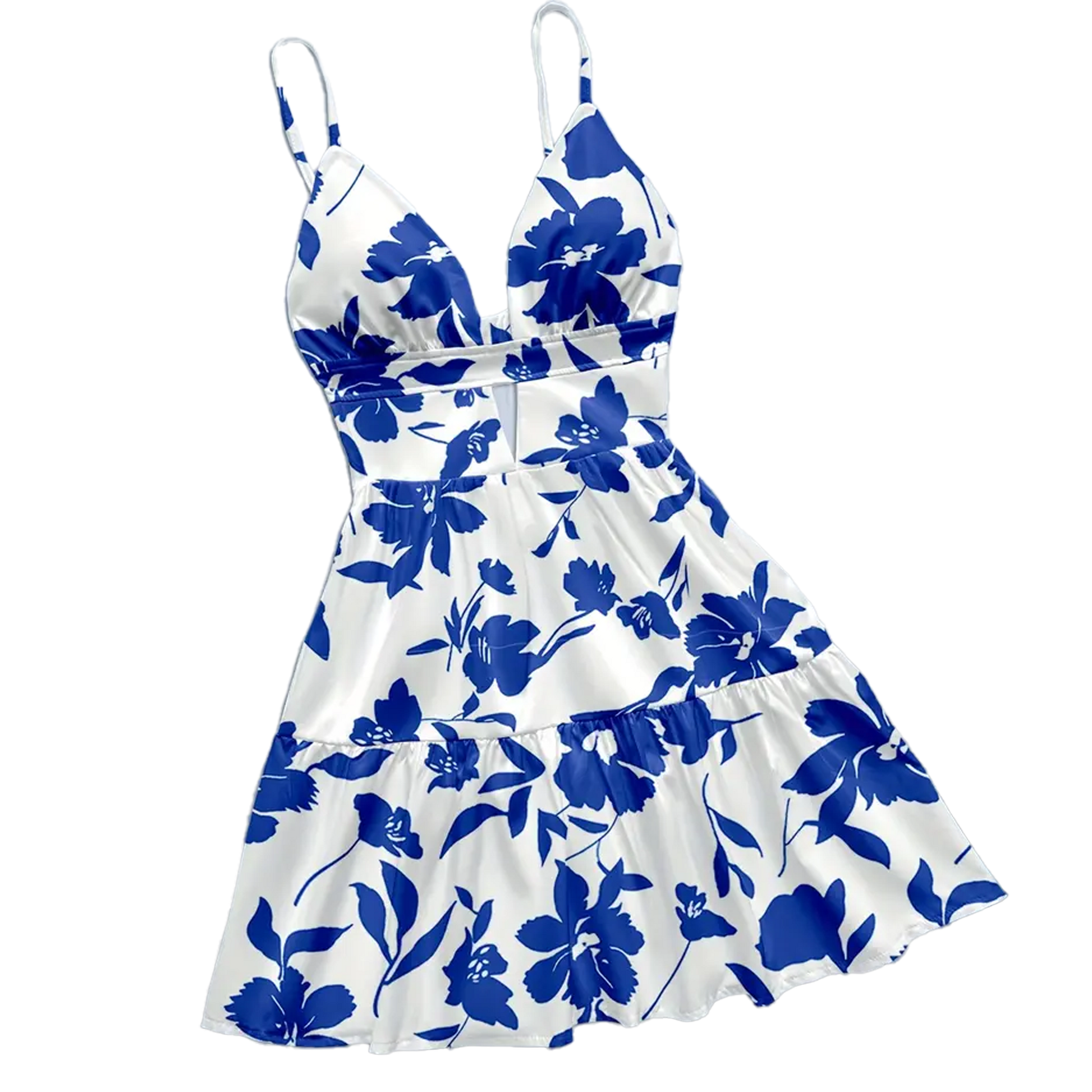 Osviežte svoj šatník týmito ľahkými letnými šatami, ktoré spájajú eleganciu s komfortom. Biela základná farba je doplnená výrazným modrým kvetinovým vzorom, ktorý dodáva šatám romantický a svieži vzhľad. Šaty majú tenké nastaviteľné ramienka, hlbší výstrih a jemne riasenú sukňu so spadnutým efektom, vďaka čomu pôsobia žensky a vzdušne. Perfektné na dovolenku, letné oslavy či bežné nosenie počas horúcich dní.