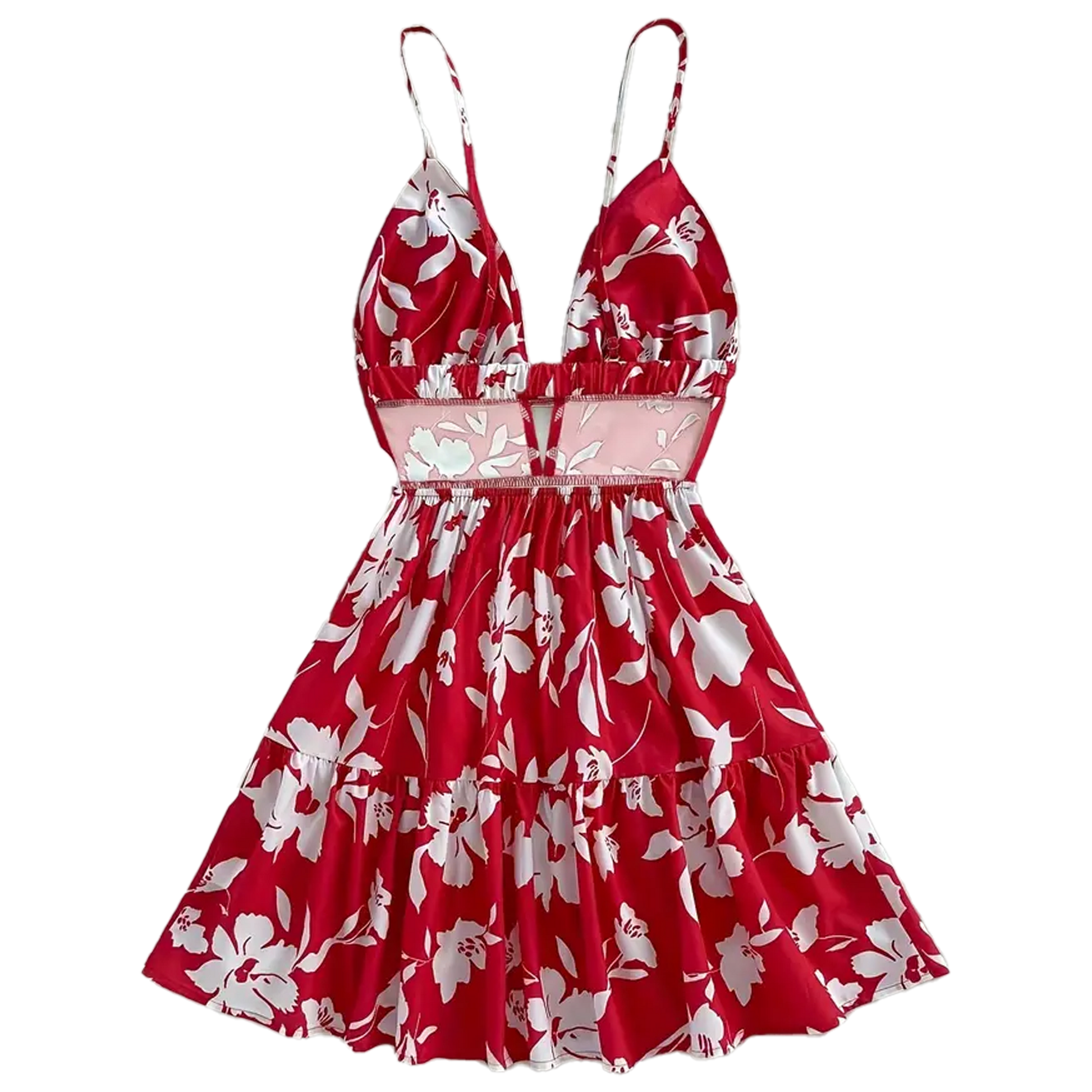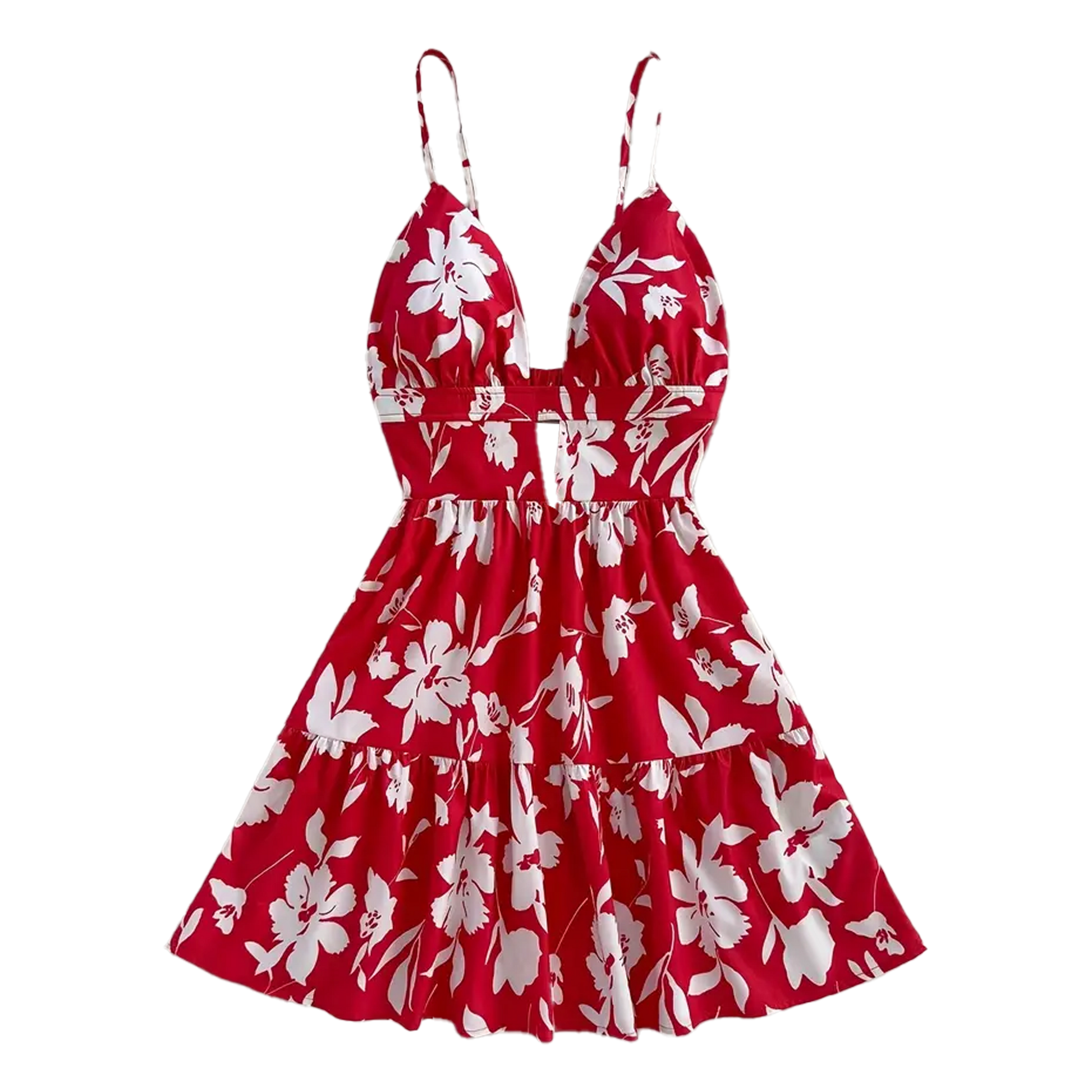 Rozžiarte svoj letný šatník výraznými červenými šatami s bielym kvetinovým vzorom. Tenké ramienka, hlboký výstrih a jemný cut-out detail pod prsiami dodávajú šatám zvodný a moderný vzhľad. Voľná volánová sukňa prináša hravosť a komfort pri každom kroku. Ľahký polyesterový materiál je ideálny na horúce dni, pláž či dovolenkové večery.