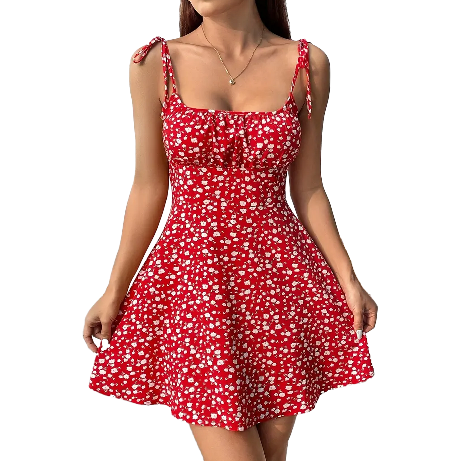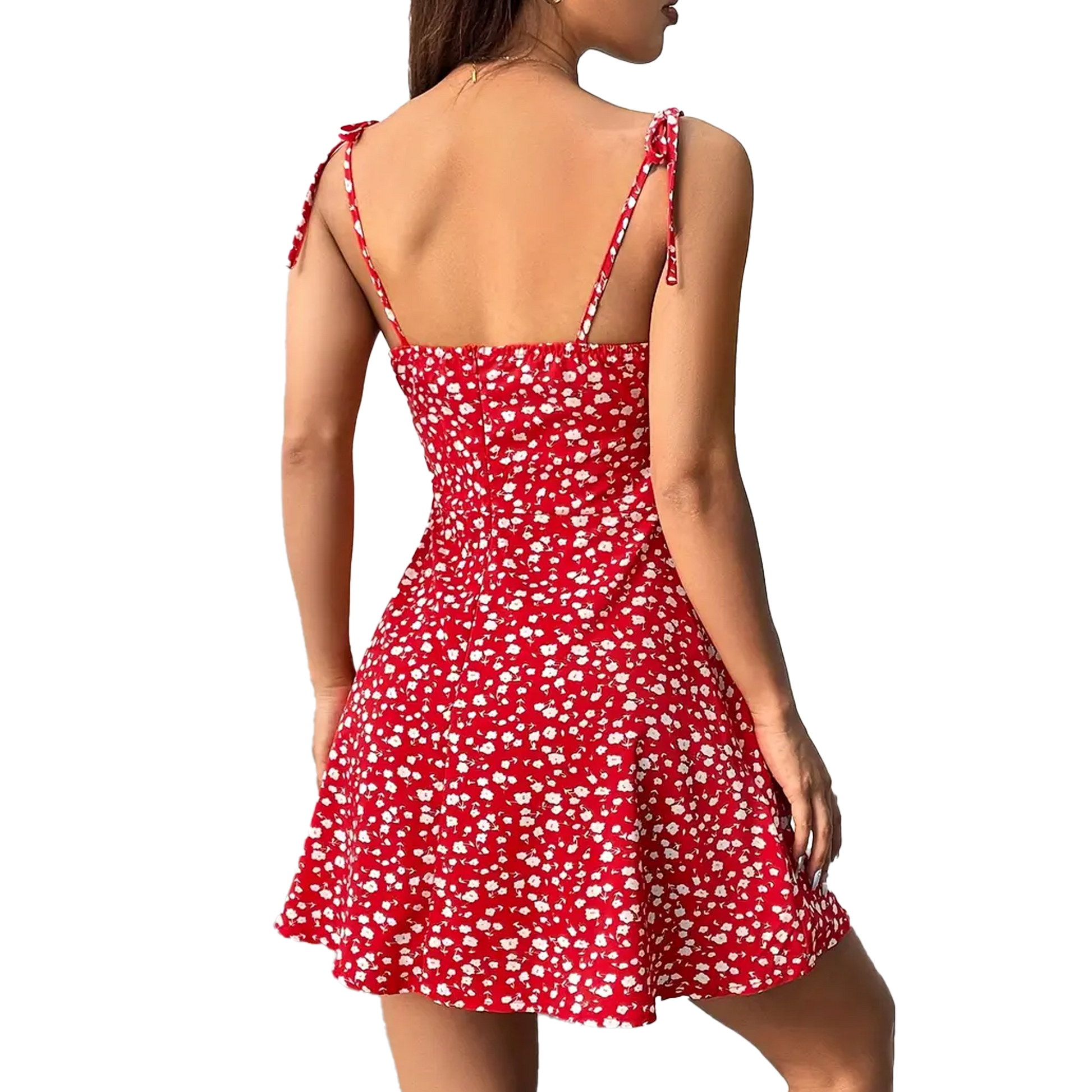 Červené mini šaty s viazanými ramienkami a kvetinovým vzorom