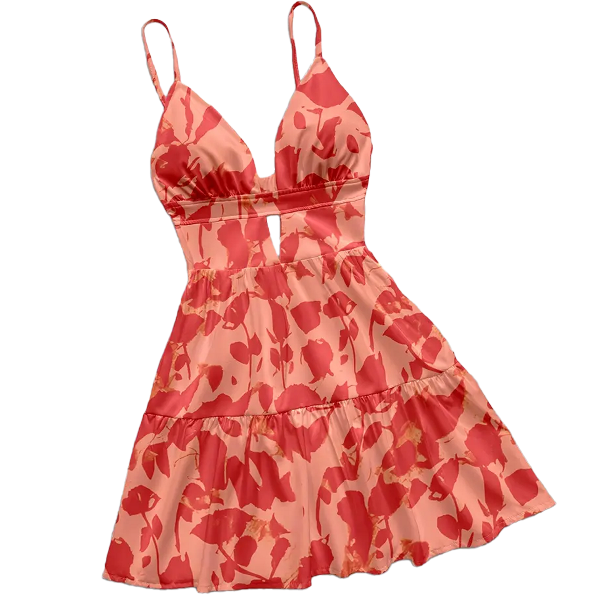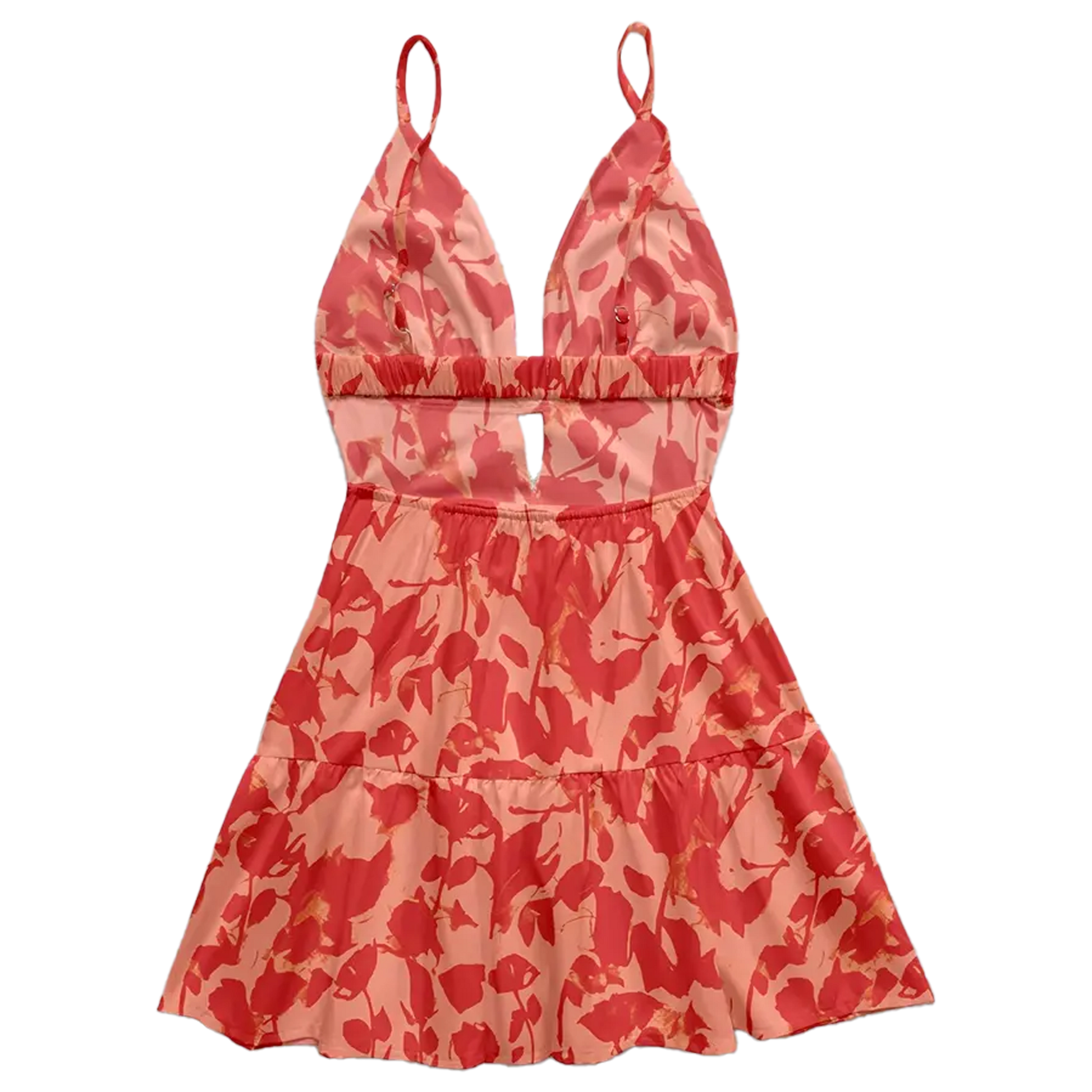 Užite si horúce dni v štýlových letných šatách na tenké ramienka. Šaty majú výrazný červeno-ružový vzor, hlboký výstrih a jemný cut-out detail pod prsiami, ktorý pôsobí moderne a žensky. Volánová sukňa dodáva šatám hravý vzhľad a zabezpečí pohodlie pri chôdzi. Ľahký polyesterový materiál je ideálny na leto, pláž alebo dovolenku pri mori.