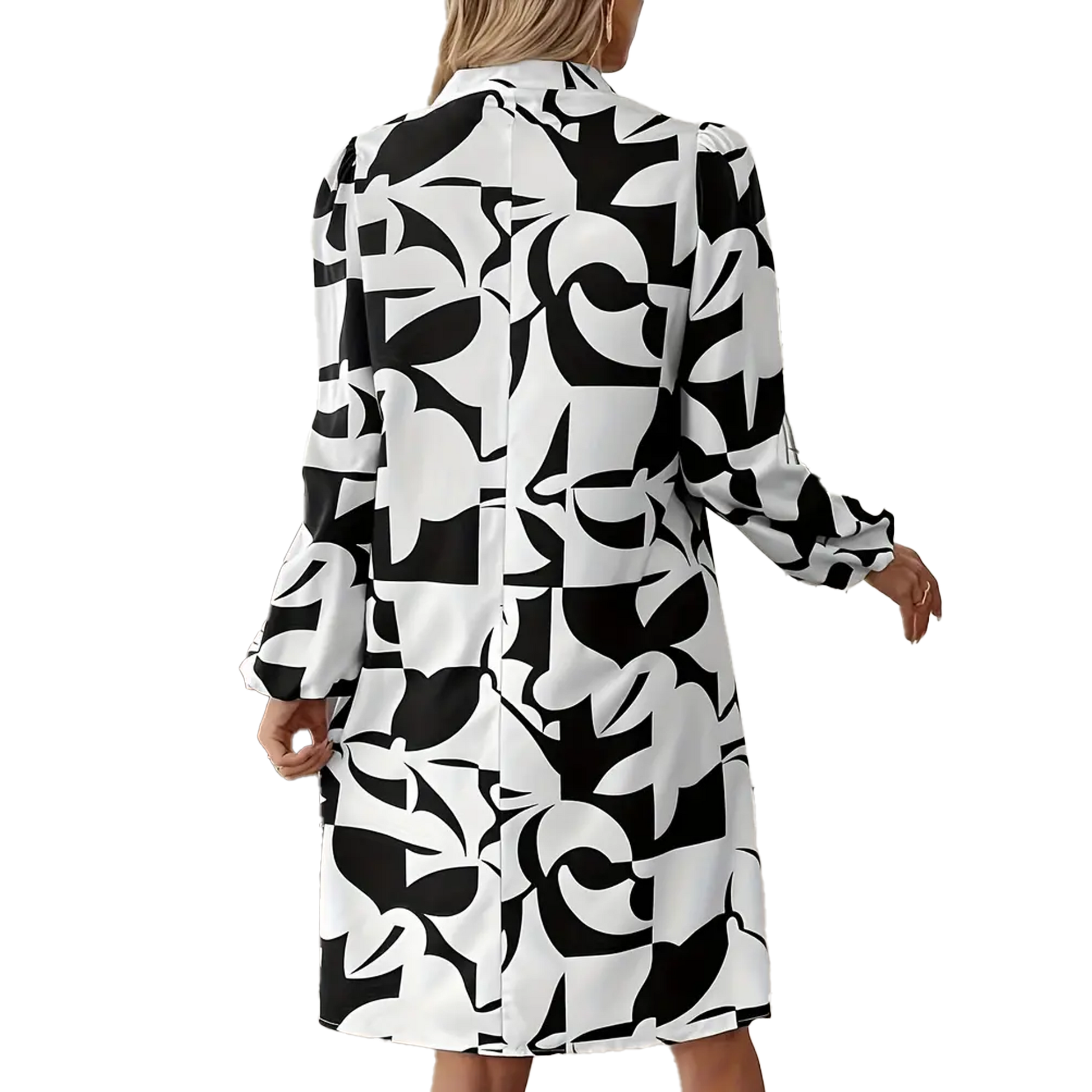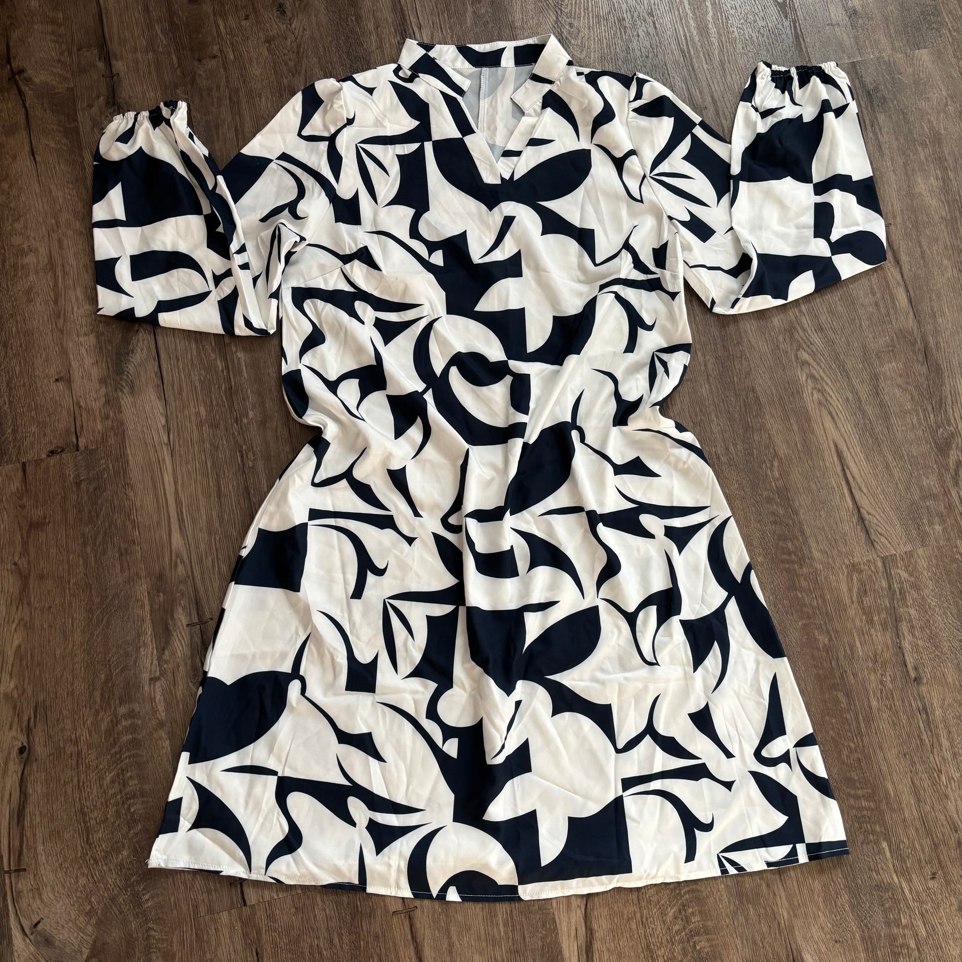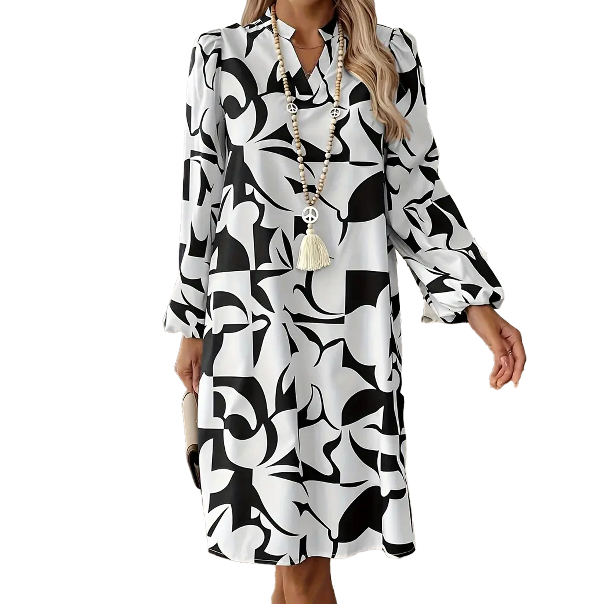 Tieto čierno-biele šaty s abstraktným vzorom sú ideálnou kombináciou elegancie a pohodlia. Midi dĺžka pôsobí decentne a univerzálne, zatiaľ čo výrazný abstraktný vzor dodáva šatám moderný a štýlový charakter. Ľahký polyesterový materiál zaručuje komfort počas celého dňa, vďaka čomu sa hodia na bežné nosenie aj spoločenské príležitosti.