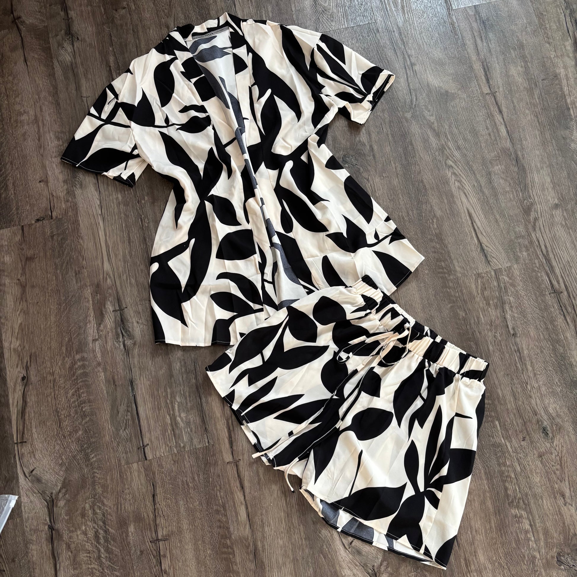 Štýlový dvojdielny komplet z ľahkého polyesterového materiálu v čierno-bielom kontrastnom vzore. Krátke šortky s pohodlným elastickým pásom a nastaviteľnou šnúrkou dopĺňa voľná košeľová blúzka s krátkymi rukávmi, ktorú možno nosiť voľne alebo previazanú v páse. Tento outfit je ideálny na letné prechádzky, dovolenky či voľný čas, pričom spája pohodlie a moderný vzhľad.