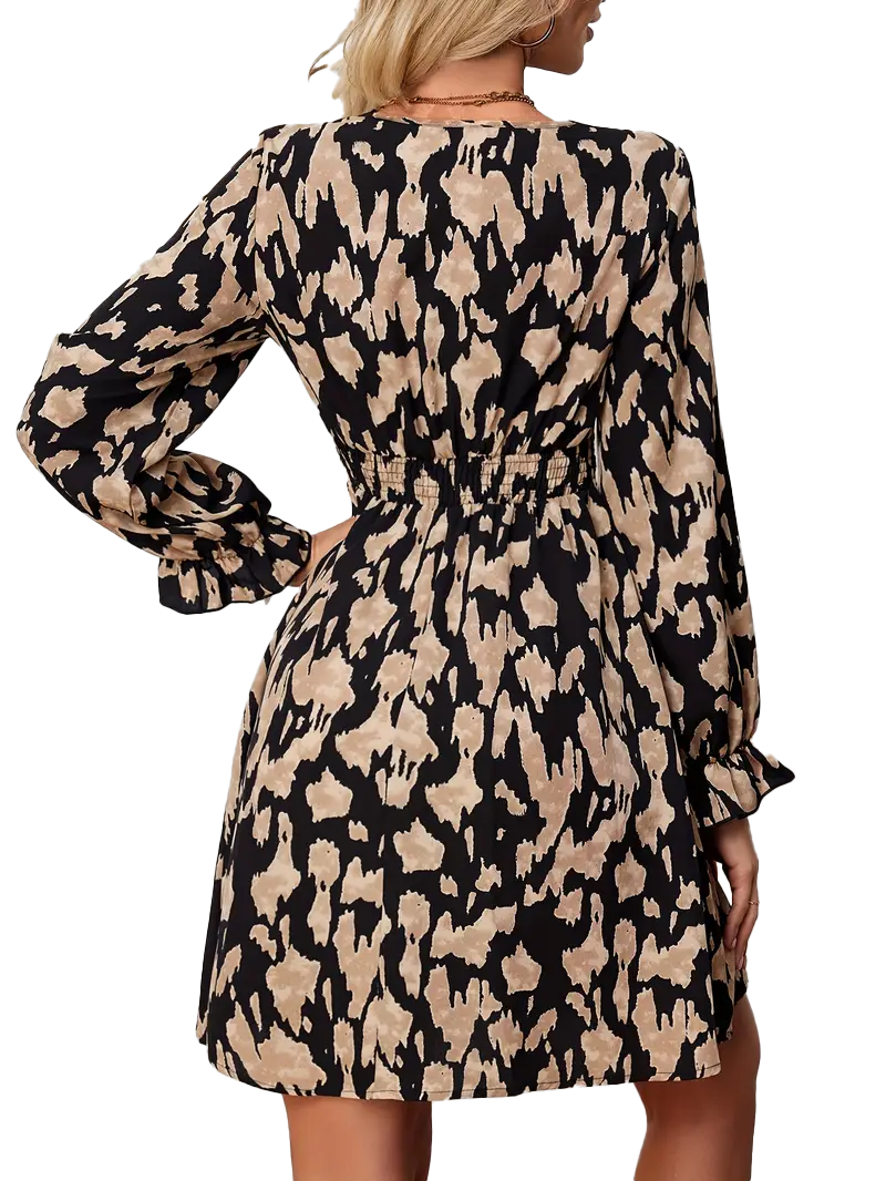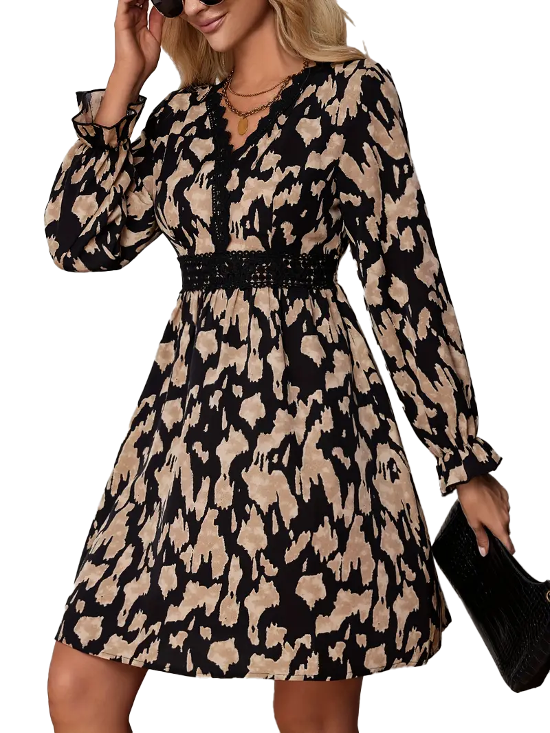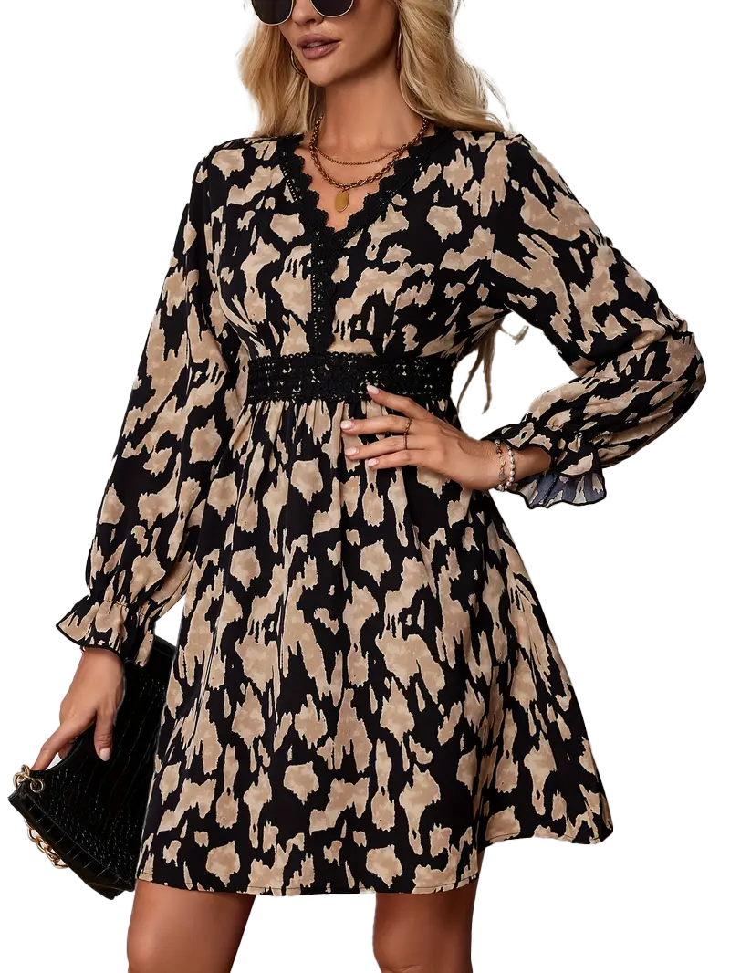 Zažiariš v týchto elegantných šatách s výrazným vzorom a výstrihom do V, ktoré pôsobia sebavedomo a štýlovo. Dlhé volánové rukávy dodávajú šatám romantický nádych, zatiaľ čo pružný pás krásne zvýrazní postavu a poskytne pohodlie pri nosení. Vďaka ľahkému materiálu s prímesou elastanu sú šaty ideálne na jar, leto aj jeseň – či už na večerný drink, spoločenskú udalosť alebo každodenné nosenie s dávkou elegancie.