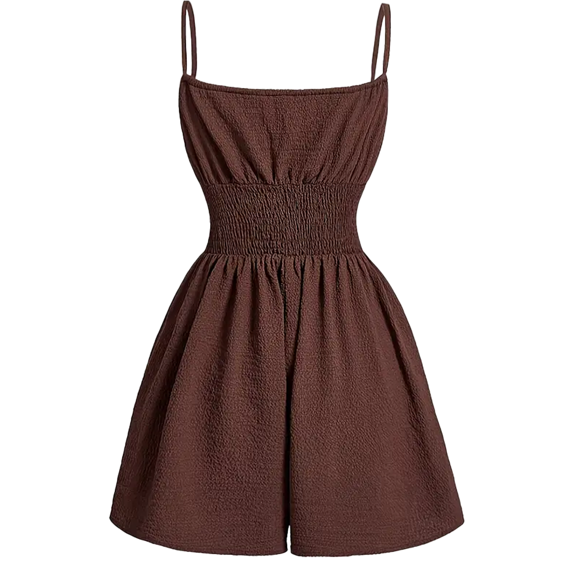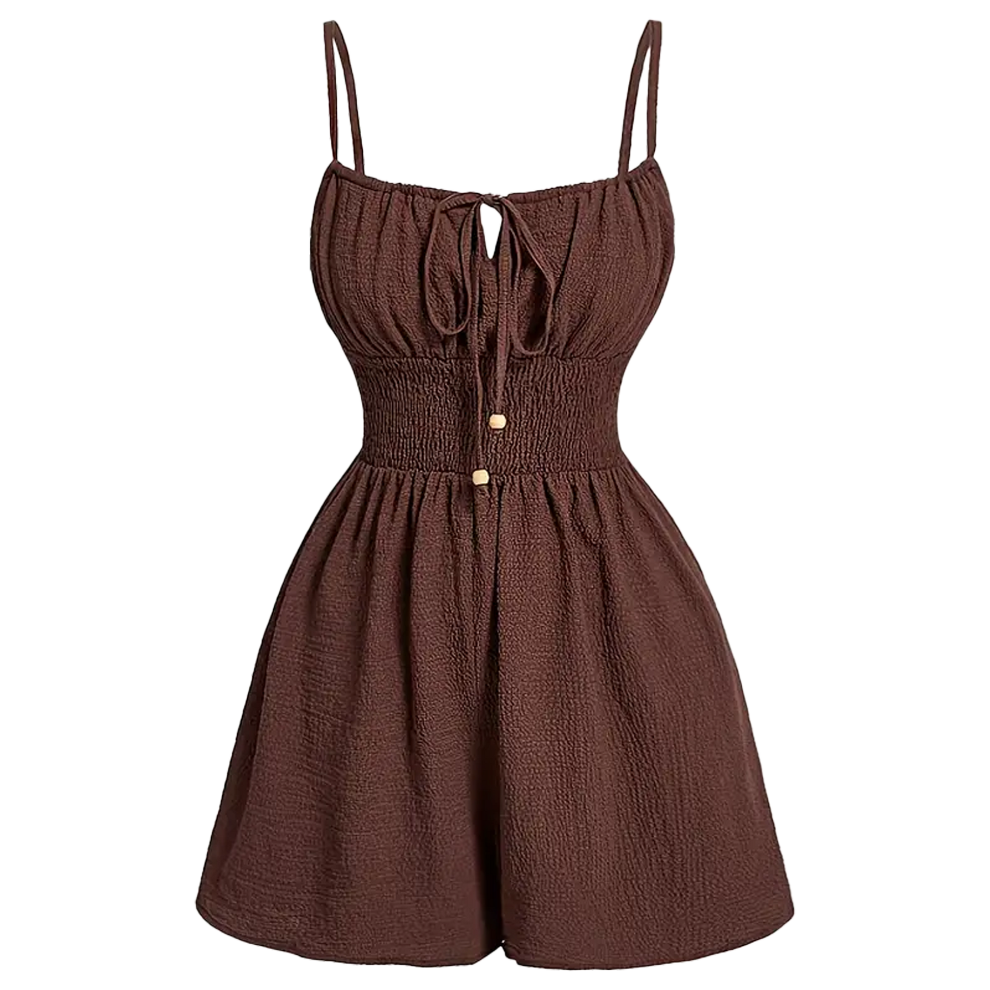 Štýlový hnedý overal s tenkými ramienkami je dokonalou voľbou na leto aj voľný čas. Elastický pás krásne zvýrazní postavu a dodá pohodlie pri nosení. Ľahký polyesterový materiál je priedušný a príjemný na pokožke, vďaka čomu sa budete cítiť sviežo počas celého dňa.