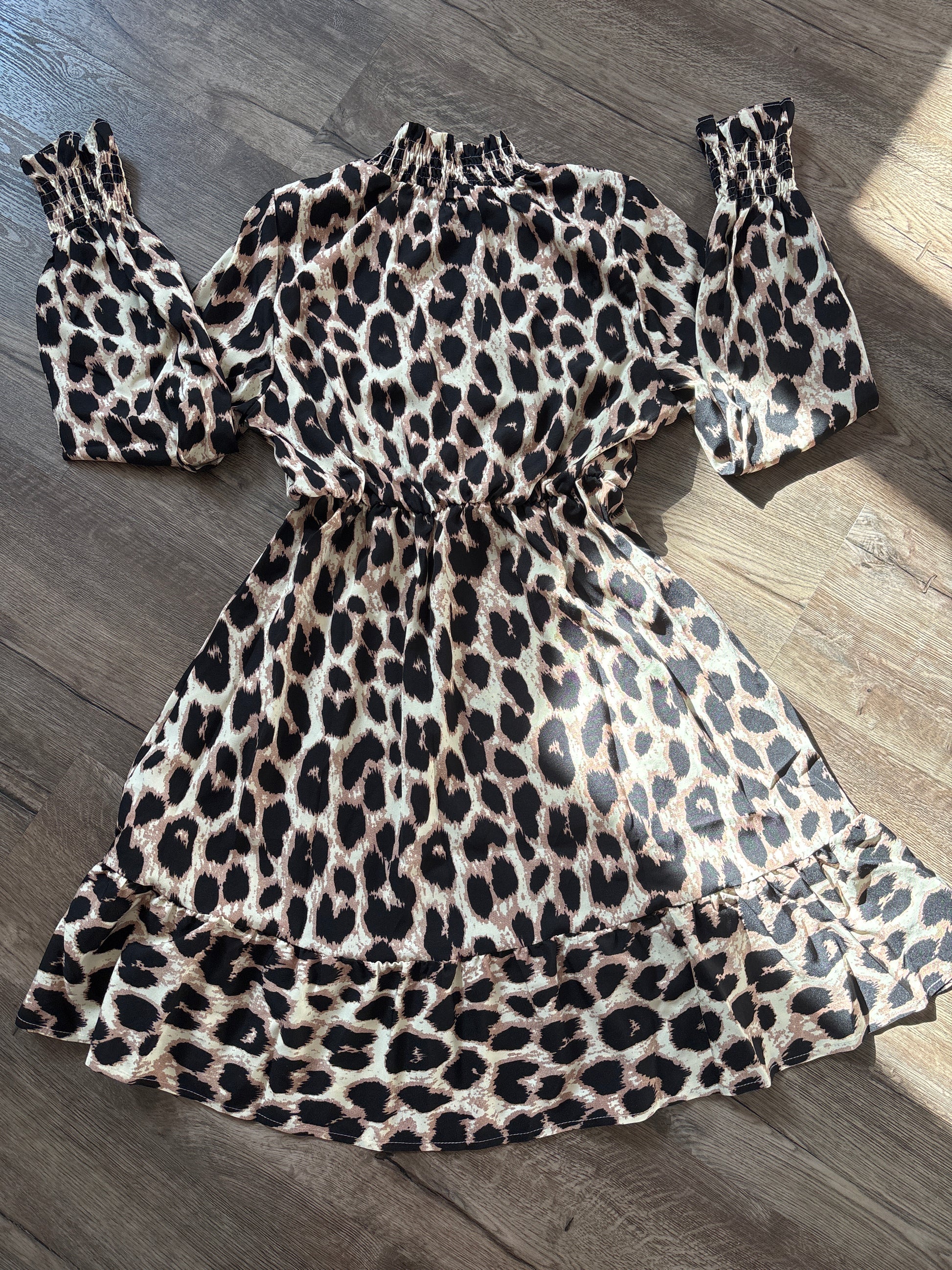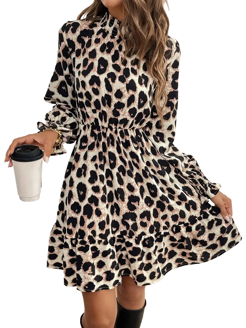 Vyniknite v týchto leopardích šatách so stojacim golierom, ktoré spájajú eleganciu s moderným štýlom. Nariasený detail v páse a rozšírený „fit & flare“ strih lichotí postave a dodáva jemne ženskú siluetu. Stojanový golier pôsobí sofistikovane, zatiaľ čo výrazný leopardí vzor zvýrazní vašu osobnosť. Ideálne na jar, leto aj jeseň – či už na večerný výjazd do mesta, pracovné stretnutie alebo spoločenskú udalosť.