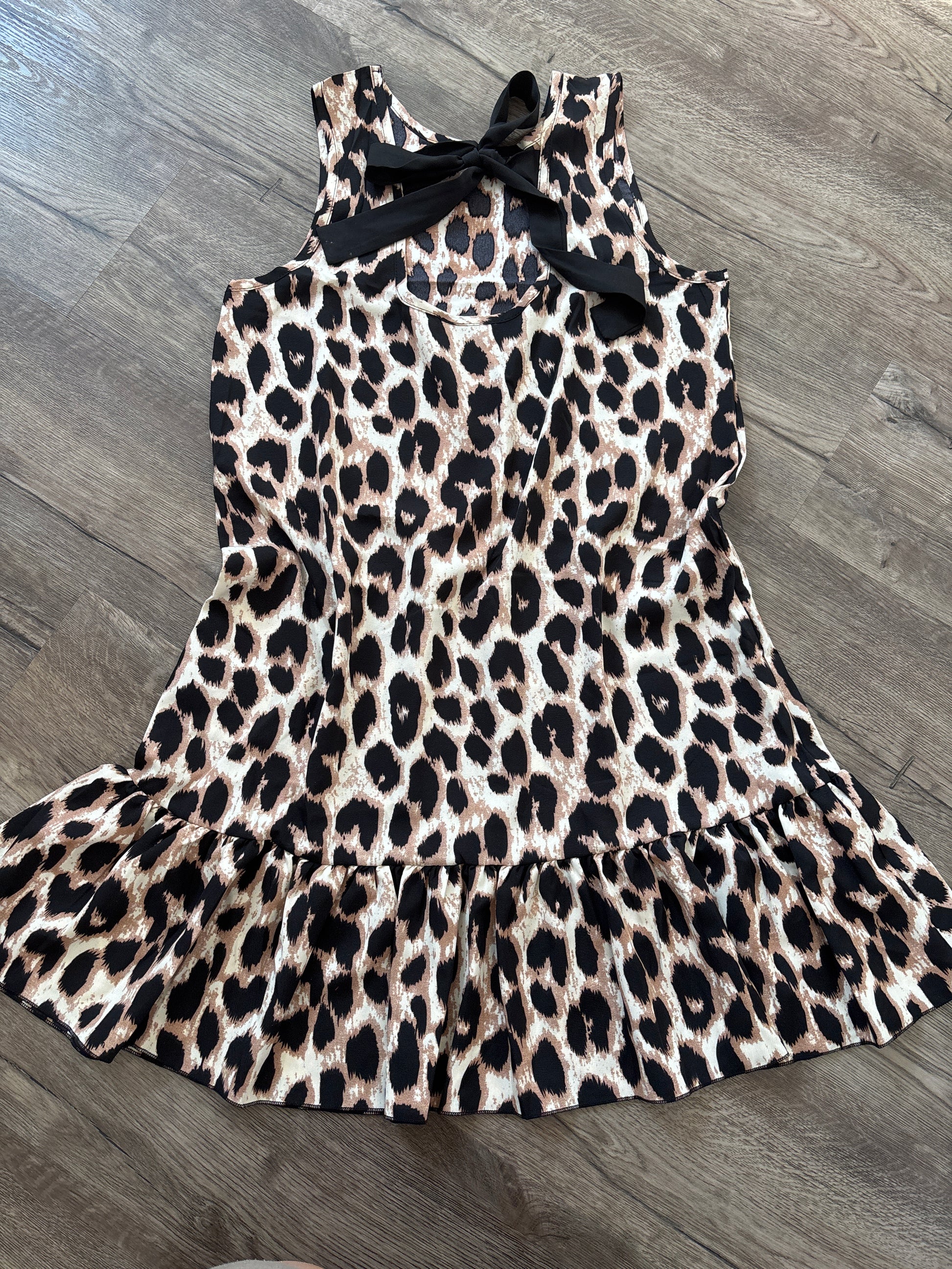 Leopardie voľné šaty s volánovým lemom a mašľou na chrbte