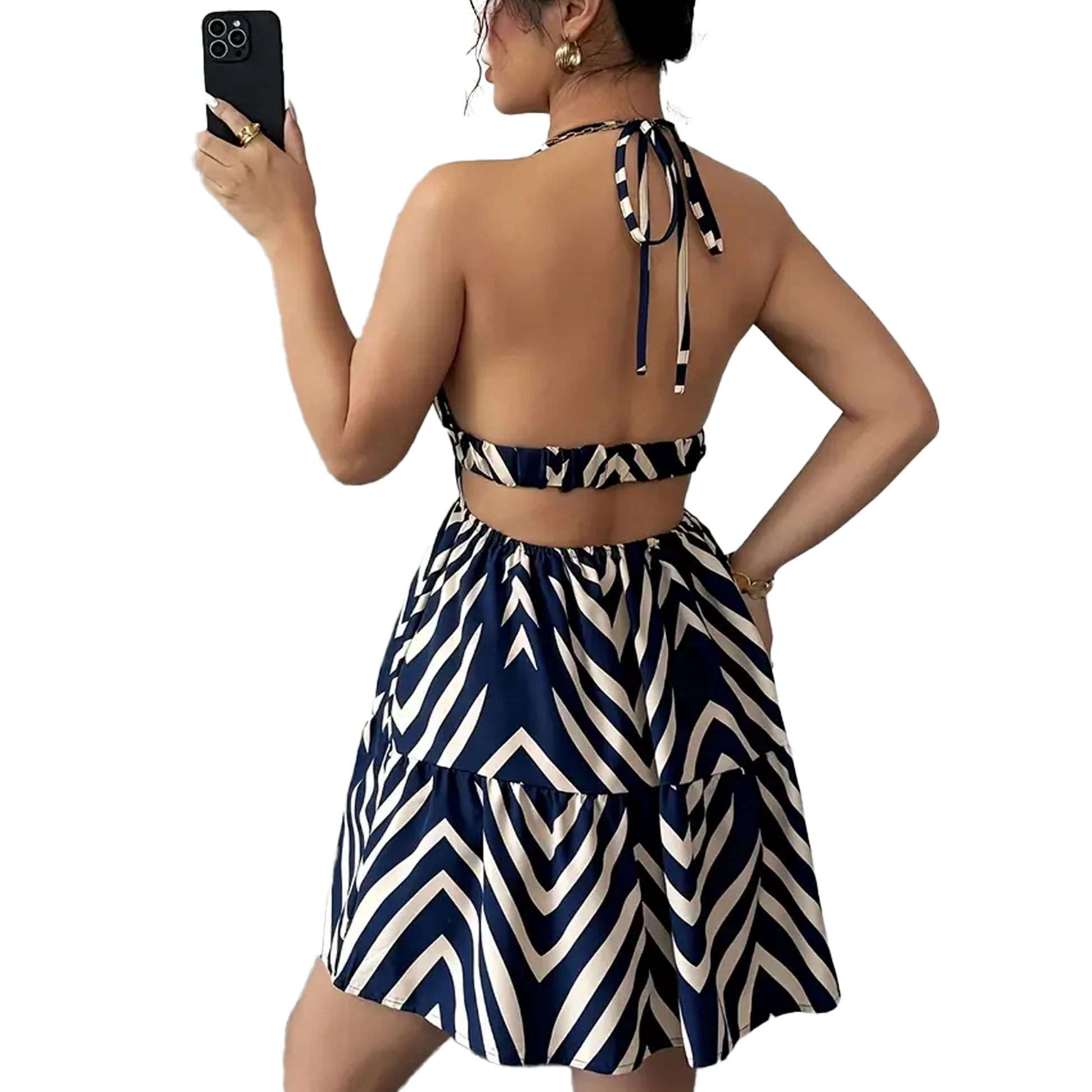 Tieto letné mini šaty s hlbokým výstrihom a výrazným geometrickým vzorom v modro-bielej kombinácii sú ideálnou voľbou pre sebavedomý a štýlový look. Ľahký polyesterový materiál sa príjemne nosí a vďaka vzdušnému strihu šaty pôsobia pohodlne aj počas horúcich dní. Viazanie okolo krku zvýrazňuje dekolt a áčková sukňa s riasením dodáva ženskosť a hravosť.