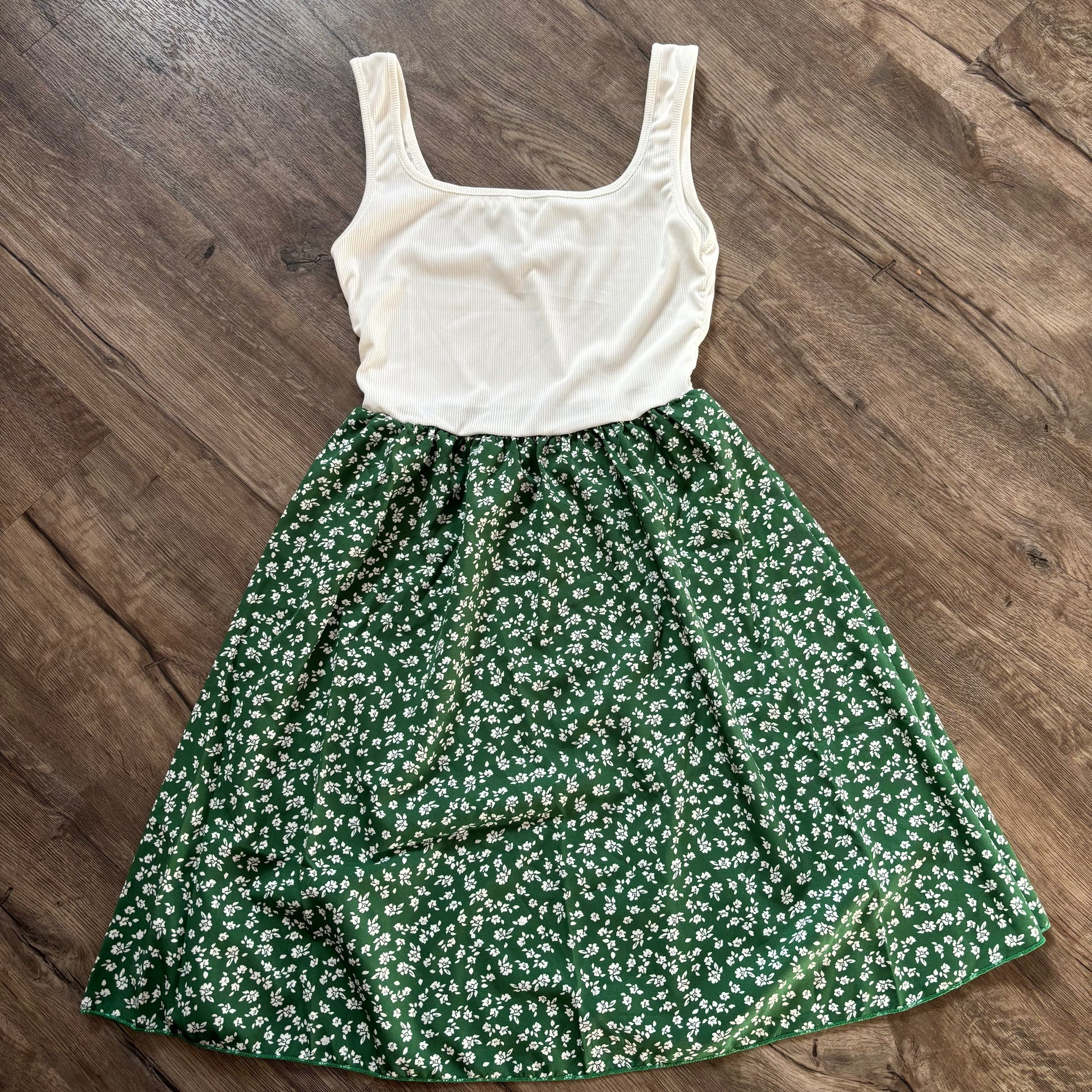 Letné šaty bez rukávov s bielym topom a zelenou kvetinovou sukňou