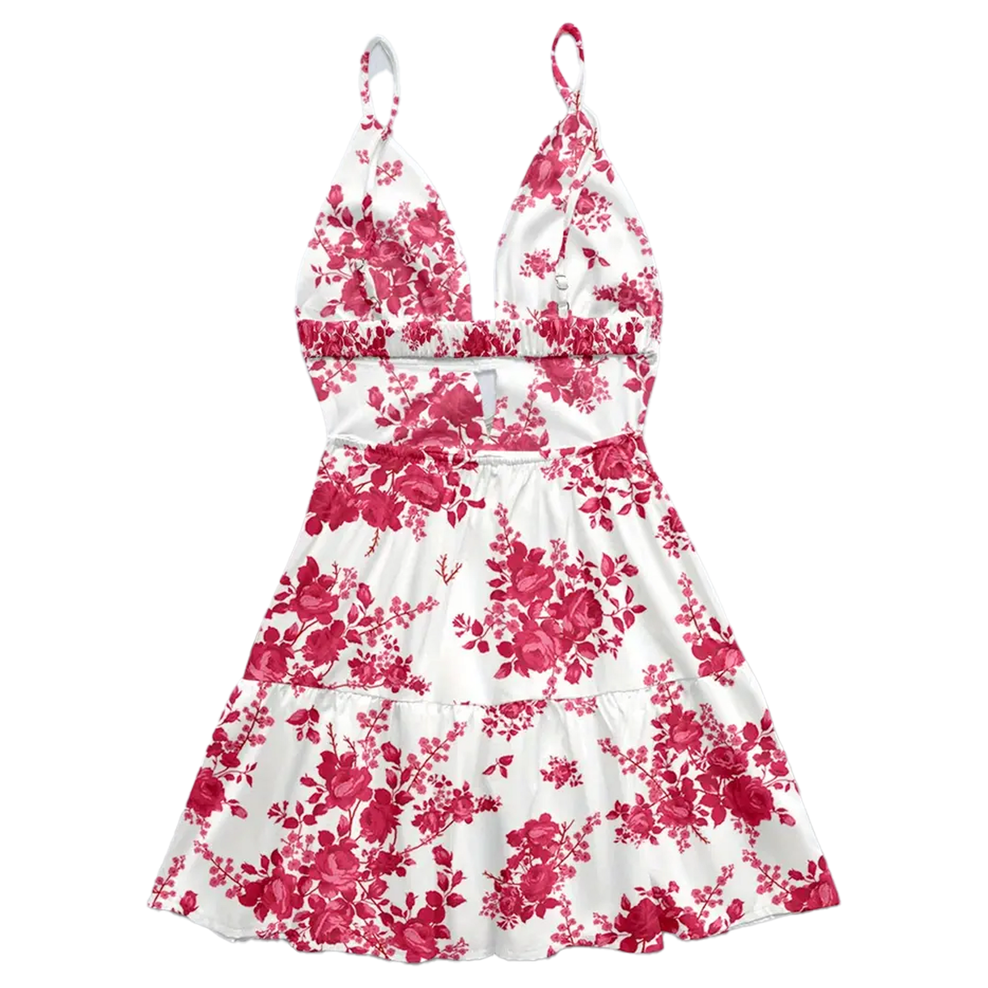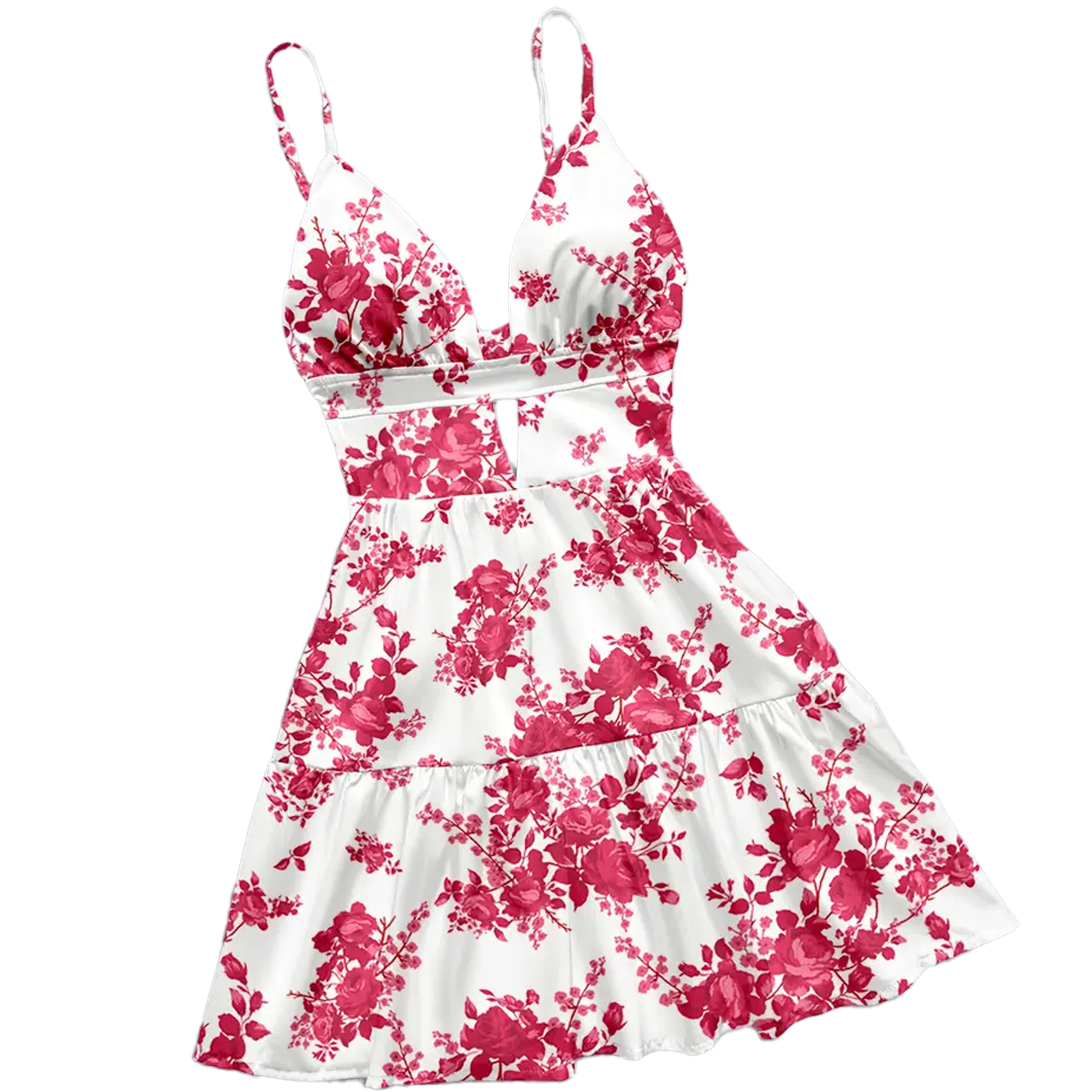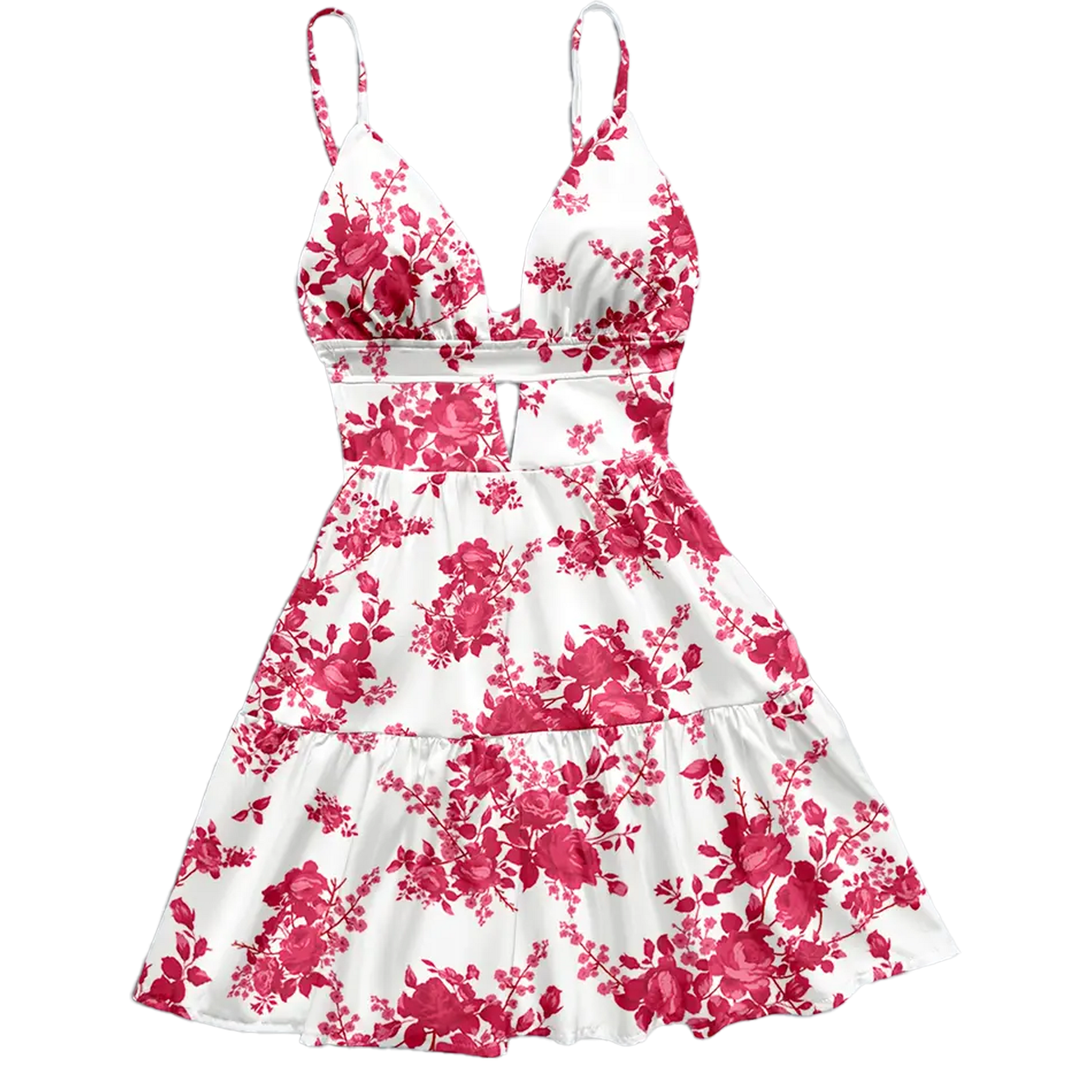 Ľahké a vzdušné mini šaty so zvýrazneným pásom a tenkými ramienkami sú ideálnou voľbou na horúce letné dni. Biely základ s kontrastným ružovým kvetinovým vzorom dodáva šatám jemný, no zároveň výrazný romantický vzhľad.